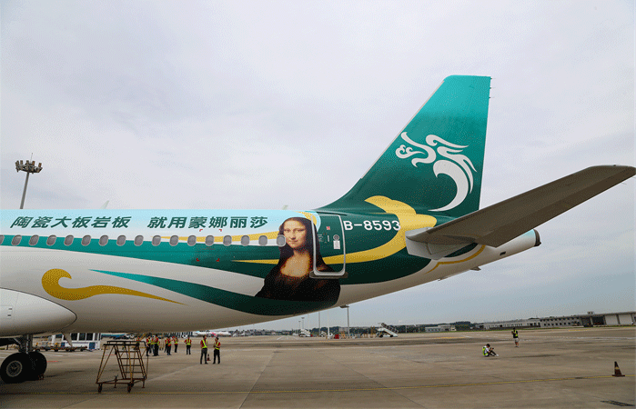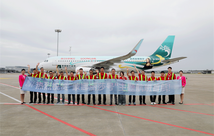 本次啟航的“蒙娜麗莎號(hào)”亞運(yùn)主題航班,在機(jī)身上巧妙結(jié)合著名畫家達(dá)芬奇創(chuàng)作的《蒙娜麗莎》畫像和端莊飄逸的中國傳統(tǒng)祥云圖案,與蒙娜麗莎標(biāo)志性品牌Logo主題色完美交融,打造出穿梭于萬米高空的藝術(shù)范客機(jī)。