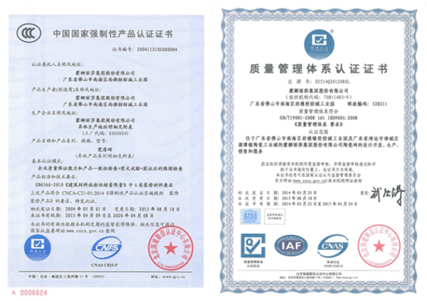 蒙娜麗莎實行標準化管理,制定了一系列內(nèi)控標準,包括技術(shù)標準、管理標準和工作標準,以嚴于國際標準的要求作為蒙娜麗莎集團的內(nèi)控標準,確保產(chǎn)品質(zhì)量完全合格。蒙娜麗莎集團于1999 年通過ISO9002:1994認證,并于2002年通過ISO9001:2000改版認證,2009年通過ISO9001:2008認證,2016年9月通過OHSAS18000體系認證。