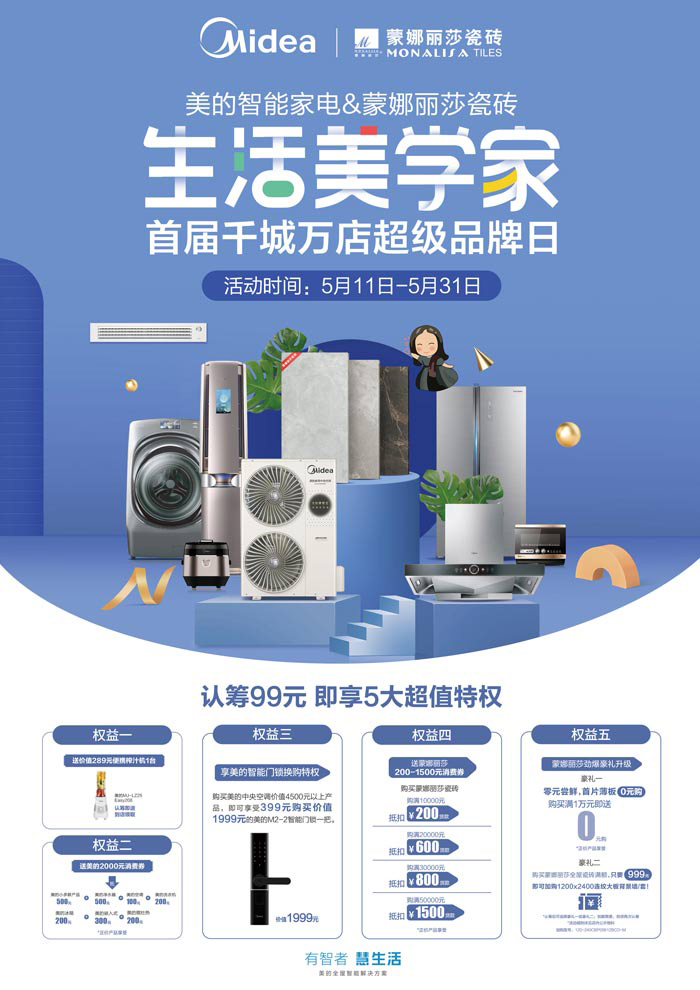5月11日至5月31日,蒙娜麗莎瓷磚“牽手”美的智能家電,組成夏日家裝“最強(qiáng)CP”,發(fā)起一場(chǎng)以“打造生活美學(xué)家”為主題的“全網(wǎng)性、全品類、全渠道、全區(qū)域”的聯(lián)合促銷盛惠?;顒?dòng)將以用戶體驗(yàn)為基點(diǎn),共同給出全屋一站式瓷磚&家電的解決方案,為消費(fèi)者帶來(lái)夏日無(wú)憂家裝體驗(yàn)。