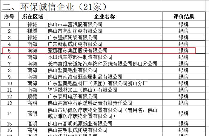 11月17日,佛山市生態(tài)環(huán)境局發(fā)布了《關(guān)于2019年度佛山市企業(yè)環(huán)境信用評(píng)價(jià)結(jié)果的通知》,蒙娜麗莎集團(tuán)再次獲評(píng)“佛山市環(huán)保誠(chéng)信企業(yè)”(綠牌),這是蒙娜麗莎集團(tuán)自2015年以來(lái),連續(xù)5年獲得佛山市企業(yè)環(huán)保綠牌。