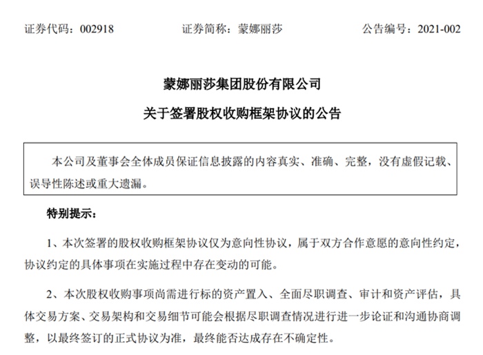 1月3日晚,蒙娜麗莎(股票代碼:002918)發(fā)布公告,蒙娜麗莎集團(tuán)股份有限公司于 2020 年 12 月 31 日召開(kāi)董事會(huì)會(huì)議,審議通過(guò)了《關(guān)于簽署股權(quán)收購(gòu)框架協(xié)議的議案》(以下簡(jiǎn)稱“議案”)。