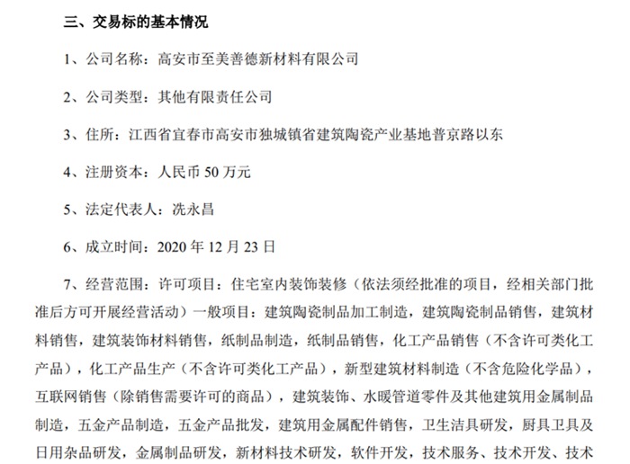 根據(jù)議案,江西普京陶瓷有限公司(以下簡(jiǎn)稱“普京陶瓷”)擬以其現(xiàn)有土地(約 980 畝工業(yè)用地)、地上房產(chǎn)(包括但不限于廠房、辦公樓、員工宿舍、倉(cāng)庫(kù)等)、9 條陶瓷生產(chǎn)線(年產(chǎn)陶瓷磚、陶瓷板約 4,000 萬(wàn)平方米)及與日常經(jīng)營(yíng)相關(guān)的其他設(shè)備、設(shè)施等通過(guò)作價(jià)出資方式置入其全資子公司高安市至美善德新材料有限公司(以下簡(jiǎn)稱“至美善德”,乙方為本次交易之目的設(shè)立的全資子公司)。董事會(huì)同意蒙娜麗莎以支付現(xiàn)金的方式受讓普京陶瓷持有的至美善德股權(quán)并成為至美善德的控股股東,并同意公司與普京陶瓷、自然人冼偉泰簽署《股權(quán)收購(gòu)框架協(xié)議》。