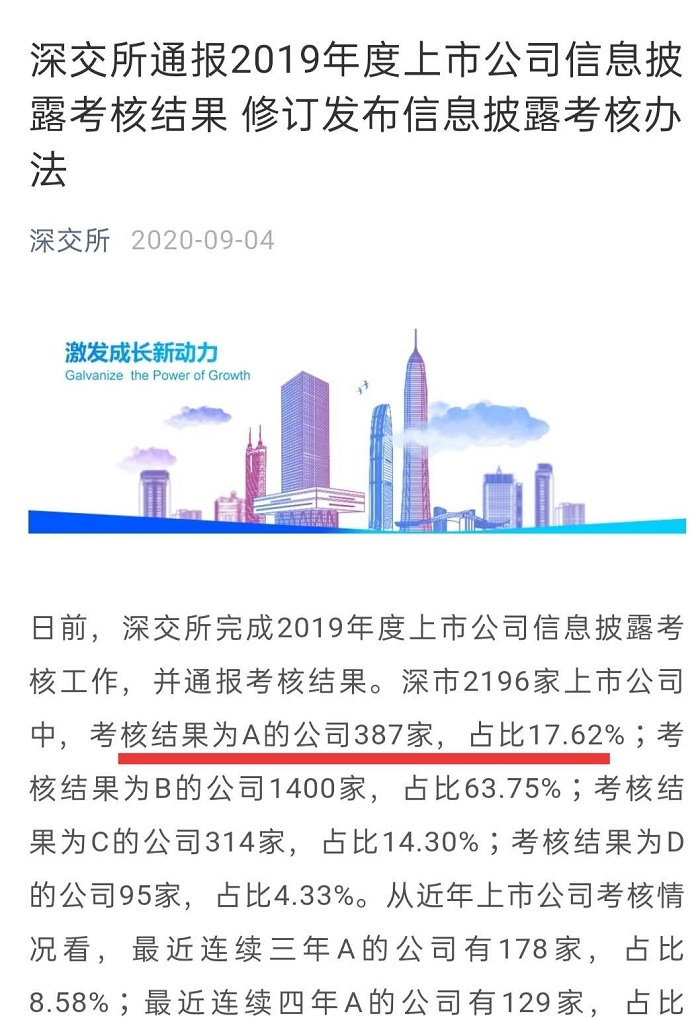 據(jù)悉,深市2196家上市公司中,考核結(jié)果為A的公司387家,占比17.62%。深交所同日發(fā)布新修訂的《上市公司信息披露工作考核辦法》以提高信息披露質(zhì)量為核心,以深化分類監(jiān)管為導(dǎo)向,結(jié)合現(xiàn)有制度執(zhí)行效果和市場(chǎng)新形勢(shì)新變化,從信息披露考核方式、考核內(nèi)容和結(jié)果用途三個(gè)方面優(yōu)化完善,進(jìn)一步提高考核評(píng)價(jià)機(jī)制的透明度和實(shí)效性。
