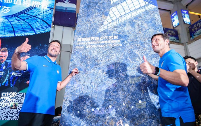 25日下午,由蒙娜麗莎瓷磚主辦的國米球星見面會在南京紅星美凱龍卡子門商場舉行,蒙娜麗莎集團董事、副總裁鄧啟棠,紅星美凱龍集團助理總裁白楊,國際米蘭國際商務(wù)總監(jiān)Tal Moriah等領(lǐng)導嘉賓出席了本次活動。帶著雙方友誼長存的美好寓意,蒙娜麗莎集團董事、副總裁鄧啟棠與國際米蘭國際商務(wù)總監(jiān)Tal Moriah在現(xiàn)場交換了禮物。隨后國米傳奇球星薩內(nèi)蒂和塞薩爾現(xiàn)身,在活動現(xiàn)場展出的蒙娜麗莎3600×1600mm大板新品上簽字留念,并親臨蒙娜麗莎門店體驗產(chǎn)品的獨特魅力。