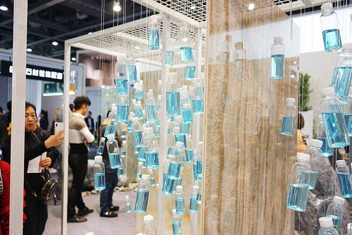 沒有富麗堂皇的門頭,不見一塵不染的樣板間,只有清脆的蟲鳴鳥叫和模擬生態(tài)的環(huán)境布置,讓蒙娜麗莎的展位在一片展商中顯得格外寧靜、個性十足。展位設(shè)置環(huán)境裝置,以多元的形式進(jìn)行產(chǎn)品展示,在場地中搭建出了沙丘、綠洲、石林和湖泊的概念場景,打造出充滿自然氣息的空間。多款明星產(chǎn)品置身其中,與不同的地形主題對應(yīng),移步換景,凸顯產(chǎn)品源于自然又能和自然和諧相融的理念。