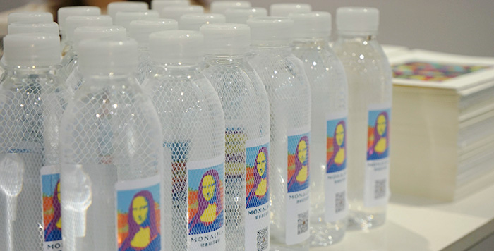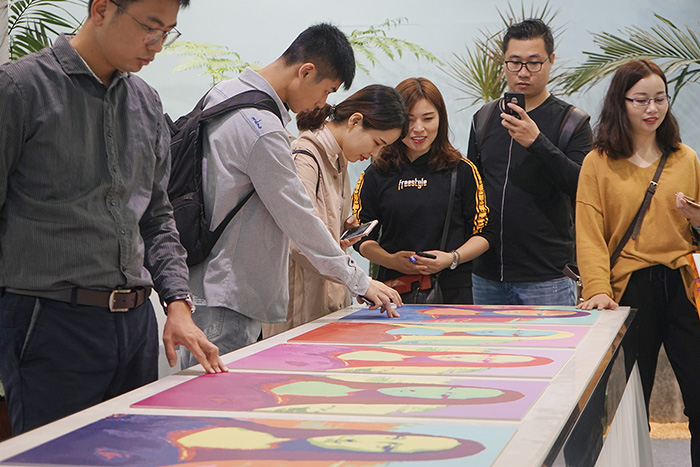 觀眾靠近端詳蒙娜麗莎波普瓷藝畫并感受其觸感