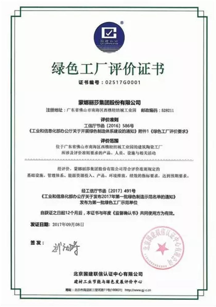 蒙娜麗莎是國(guó)家工信部“綠色工廠示范單位”,也是“資源節(jié)約型、環(huán)境友好型”試點(diǎn)創(chuàng)建企業(yè)
