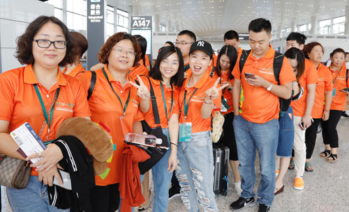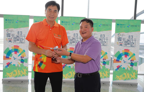 航班出發(fā)前,蒙娜麗莎集團(tuán)聯(lián)合南方航空舉行了簡(jiǎn)短的送機(jī)儀式。乘客們身著醒目亮麗的定制服裝,一早便在白云機(jī)場(chǎng)集結(jié)完畢,隨后蒙娜麗莎集團(tuán)副總裁鄧啟棠和南方航空相關(guān)負(fù)責(zé)人互換了紀(jì)念品,航班正式起飛前往雅加達(dá)。