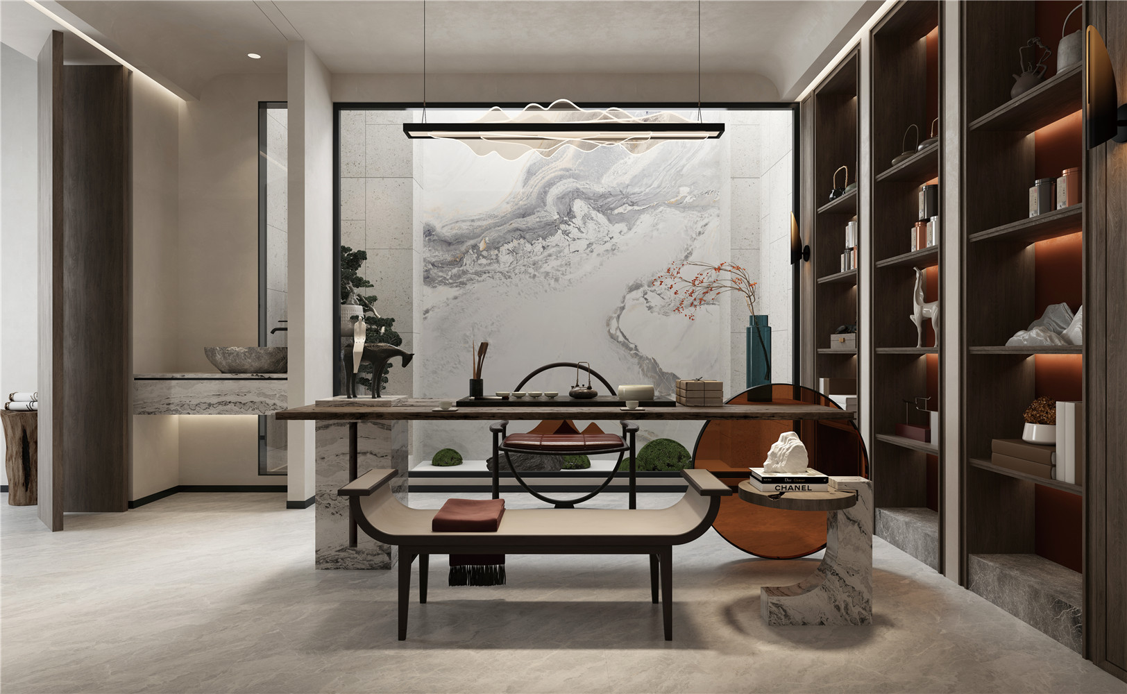 棲于大地,心歸自然。 如湖面一般伴隨色彩與肌理的延伸, 將天空漂涌的云彩、自然的滲透、光影的流動(dòng)一一還原, 放眼望去如夢(mèng)如幻。 這歸于自然、隱于山水的深遠(yuǎn)意境給人以無限想象。