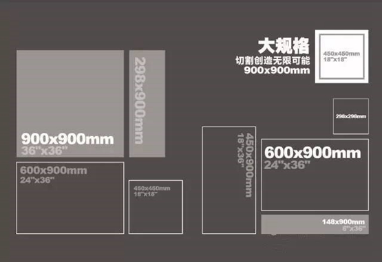 大規(guī)格設(shè)計,不是單純?yōu)榱恕按蟆倍按蟆?,而是“大”得有好處,?span style="font-weight:bold;">尺寸規(guī)格設(shè)計能更好滿足多種切割應(yīng)用,例如300*300mm、450*450mm、450*900mm、300*900mm、600*900mm、225*900mm、675*900等多種常用規(guī)格,鋪貼更靈活,為設(shè)計師提供更廣闊的設(shè)計空間。